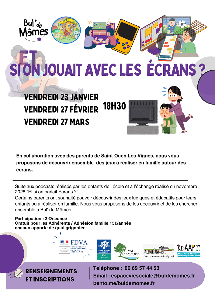 En 2025, Bul’ de Mômes a mené un projet en partenariat avec l’école de Saint-Ouen-les-Vignes, la commune, la Maison Départementale des Solidarités (MDS), l’appui de la Communauté de Communes du Val d’Amboise (CCVA), de la CAF Touraine et le soutien financier du Fonds pour le Développement de la Vie Associative (FDVA).