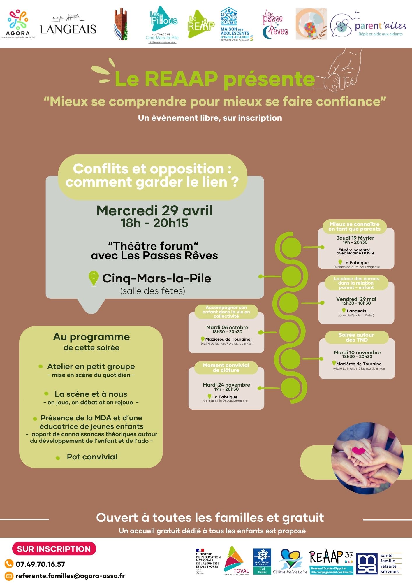 Le parcours REAAP (Réseau d’Écoute, d’Appui et d’Accompagnement des Parents) 2026, intitulé « Mieux se comprendre pour mieux se faire confiance », se poursuit avec une deuxième action organisée le mercredi 29 avril à 18h, à la salle des fêtes de Cinq-Mars-la-Pile.